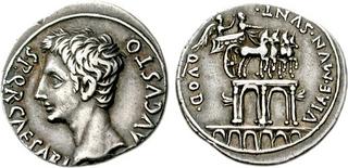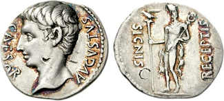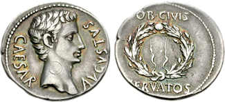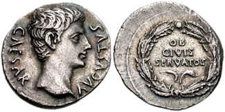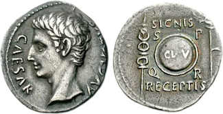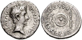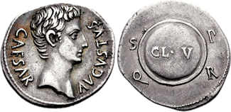 AR Denarius - RIC I, 35 | No photo | Oak-wreathed head of Augustus left / CAESAR AVGVSTVS in two lines above and below a shield inscribed CL V. | R5 |