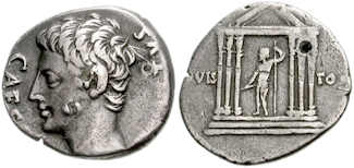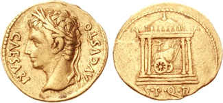 AV Aureus - RIC I, 27 | No photo | Augustus. 27 BC-AD 14. AV Aureus . Spanish mint - Emerita. Struck 19-18 BC. AVGVSTVS, bare head right / IOV-TON, hexastyle temple | R4-5 |