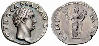 Denarius from 9 March 69, Rome. (IMP) OTHO CAESAR AVG TR P Bare head to r. / PONT – MAX Ceres standing facing, holding two corn ears and cornucopia. RIC -, (RIC 20 as aureus). BMC 9. C. 11. (Image courtesy Numismatica Ars Classica) | ? |