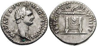 DOMITIAN. 81-96 AD. AR Denarius (3.54 gm). Struck 81 AD. IMP CAES DOMITIANVS AVG P M, laureate head right / TR P COS VII DES VIII P P, Thunderbolt on table. RIC II 16; BMCRE 15; RSC 575. (Image courtesy CNG) | |
