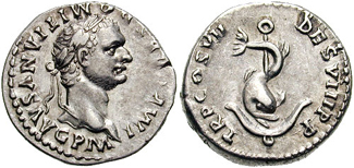 DOMITIAN. 81-96 AD. AR Denarius (3.51 gm). Struck 81 AD. IMP CAES DOMITIANVS AVG P M, laureate head right / TR P COS VII DES VIII, Dolphin coiled around anchor. RIC II 20; BMCRE 20; RSC 568. (Image courtesy CNG) | |
