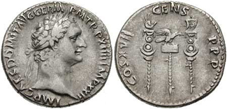 DOMITIAN. 81-96 AD. AR Denarius (3.54 gm). Struck 81 AD. IMP CAES DOMITIANVS AVG P M, laureate head right / TR P COS VII DES VIII P P, Thunderbolt on table. RIC II 16; BMCRE 15; RSC 575. (Image courtesy CNG) | |