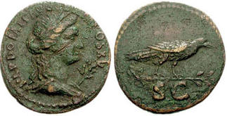 DOMITIAN. 81-96 AD. Semis. (19mm, 2.70 gm). Struck 90-91 AD. Laureate and draped bust of Apollo right; branch before / Raven standing right on branch. RIC II 398a; Cohen 527. (Image courtesy CNG) | |