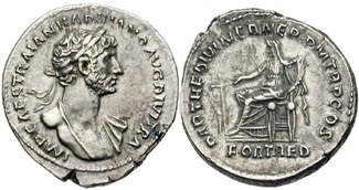 HADRIAN. 117-138 AD. AR Denarius (3.41 gm). Struck 117 AD. IMP CAES TRAIAN HADRIANO AVG DIVI TRA, laureate, draped, and cuirassed bust right / PARTH F DIVI NER NEP P M TR P COS, FORT RED in exergue, Fortuna seated left, holding rudder and cornucopiae. RIC II 10; BMCRE 20; RSC 749a. (Image courtesy CNG) | |