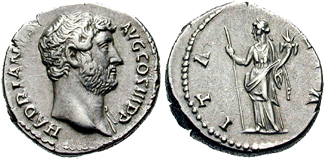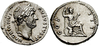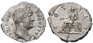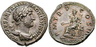 HADRIAN. 117-138 AD. AR Denarius (3.29 gm). Struck 125-128 AD. HADRIANVS AVGVSTVS, laureate head right, slight drapery on left shoulder / COS III, Concordia seated left, holding patera and resting elbow on statue of Spes. RIC II 172; BMCRE 392; RSC 328. (Image courtesy CNG) | |