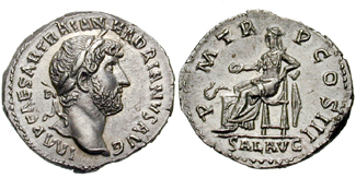 Hadrian. 117-138 AD. AR Denarius (3.35 gm). IMP CAESAR TRAIAN HADRIANVS AVG, laureate, draped bust right / P M TR P COS III, CONCORD in exergue, Concordia seated left holding patera. RIC II 118; BMCRE 258 var.; RSC 255b. (Image courtesy CNG) | |