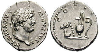 HADRIAN. 117-138 AD. AR Denarius (3.24 gm). Struck 125-128 AD. HADRIANVS AVGVSTVS, laureate head right, drapery on far shoulder / COS III, simpulum, sprinkler, jug, and lituus. RIC II 198; BMCRE 453; RSC 454 (Image courtesy CNG) | |