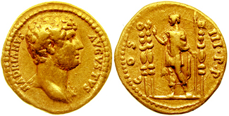 HADRIAN. 117-138 AD. AV Aureus (6.88 gm). Struck 132-134 AD. HADRIANVS AVGVSTVS, bare bust right, wearing aegis on left shoulder / COS III P P, Hadrian standing left, holding spear; two standards to left, one to right. RIC II 204b; Cohen 486. (Image courtesy CNG) | |