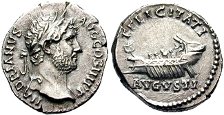 HADRIAN. 117-138 AD. AR Denarius (3.35 gm). Struck 134-138 AD. HADRIANVS AVG COS III P P, laureate head right / FELICITATI AVGVSTI, Galley travelling left. RIC II 240; BMCRE 621; RSC 712. (Image courtesy CNG) | |