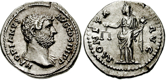 HADRIAN. 117-138 AD. AR Denarius (3.19 gm). Struck 134/5-138 AD. HADRIANVS AVGVSTVS COS III P P, bare-headed bust right, drapery on far shoulder / MONETA AVG, Moneta standing left, holding scales and cornucopiae. RIC II 256; BMCRE 976 note; RSC 965. (Image courtesy CNG) | |