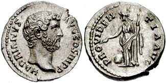 HADRIAN. 117-138 AD. AR Denarius (3.31 gm). Struck 134/5-138 AD. HADRIANVS AVGVSTVS COS III P P, bare head right / PROVIDEN-TIA AVG, Providentia standing left, holding sceptre; globe below. RIC II 261; BMCRE 694; RSC 1204. (Image courtesy CNG) | |