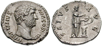 HADRIAN. 117-138 AD. AR Denarius (3.21 gm). Struck 119-125 AD. IMP CAESAR TRAIAN HADRIANVS AVG, laureate head right / P M TR P COS III, SAL AVG in exergue, Salus seated left, holding patera and feeding snake coiled around altar. RIC II 137a; BMCRE 314; RSC 1324. (Image courtesy CNG) | |