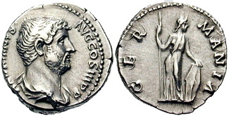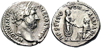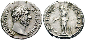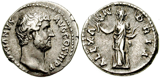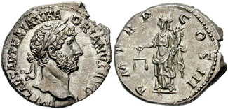 HADRIAN. 117-138 AD. AR Denarius (3.26 gm). IMP CAESAR TRAIAN HADRIANVS AVG, laureate head right / P M TR P COS III, Aequitas or Moneta left, holding scales. RIC II 80; RSC 1119. (Image courtesy CNG) | |