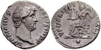 HADRIAN. 117-138 AD. AR Denarius (3.44 gm). Struck 134-138 AD. HADRIANVS AVG COS III PP, bare head right / VENERIS FE-LICIS, Venus seated left, holding Cupid and spear; globe in exergue. RIC II 280 note; BMCRE 756; RSC 1449b. (Image courtesy CNG) | |