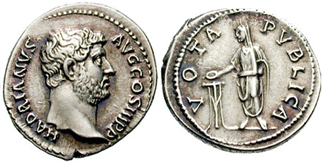 HADRIAN. 117-138 AD. AR Denarius (3.35 gm). Struck 134-138 AD. HADRIANVS AVG COS III P P, bare head right / VOTA PVBLICA, Hadrian standing left, sacrificing with patera over tripod. RIC II 290; BMCRE 777; RSC 1481. (Image courtesy CNG) | |