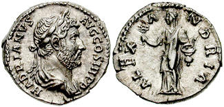 HADRIAN. 117-138 AD. AR Denarius (3.64 gm). Struck 134-138 AD. HADRIANVS AVG COS III P P, bare head right / ITA-LIA, Italia standing left, holding sceptre and cornucopiae. RIC II 307; BMCRE 850; RSC 867. (Image courtesy CNG) | |