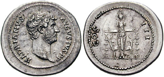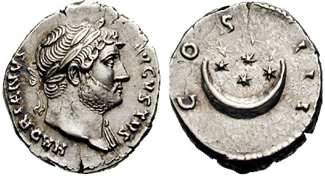 HADRIAN. 117-138 AD. AR Denarius (3.24 gm). Struck 132-134 AD. HADRIANVS AVGVSTVS, laureate head right / COS III, seven stars above crescent moon. RIC II 202; BMCRE 463; RSC 465. (Image courtesy CNG) | |