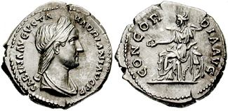 SABINA, wife of Hadrian. AR Denarius (3.33 gm). SABINA AVGVSTA HADRIANI AVG P P, diademed and draped bust right, hair in queue down back / CONCOR-DIA AVG, Concordia seated left, holding patera and resting arm on statuette of Spes; cornucopiae below chair. RIC II 398 (Hadrian); BMCRE 895 (Hadrian); RSC 12. (Image courtesy CNG) | |