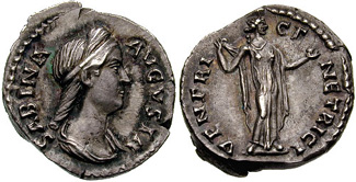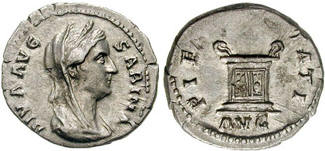 DIVA SABINA, wife of Hadrian. Died 137 AD. AR Denarius (2.92 gm). DIVA AVG SABINA, veiled bust right, wearing wreath of grain ears / PIE-TATI, AVG in exergue, altar. RIC II 422a (Hadrian); RSC 56. (Image courtesy CNG) | |