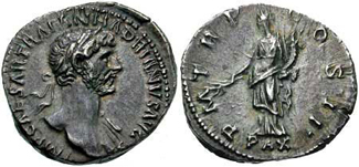 Hadrian. 117-138 AD. AR Denarius (3.34 gm). Struck 118 AD. IMP CAESAR TRAIAN HADRIANVS AVG, laureate bust right, slight drapery on far shoulder / P M TR P COS III, Pax standing left, holding branch and cornucopiae; PAX in exergue. RIC II 44; BMCRE 78; RSC 1015. (Image courtesy CNG) | |