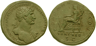 HADRIAN. 117-138 AD. Æ Sestertius (22.94 gm). Struck 117 AD. IMP CAES DIVI TRA PARTH F DIVI NER NE-P TRAIANO HADRIANO AVG, laureate bust right, drapery on left shoulder / PONT MAX TR POT COS, FORT RED/S C in two lines in exergue, Fortuna seated left holding rudder and cornucopiae. RIC II 541a var. (cuirassed); BMCRE 1111; Cohen 751 var. (same). (Image courtesy CNG) | |