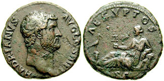 HADRIAN. 117-138 AD. Æ As (11.46 gm). Struck 134-138 AD. HADRIANVS AVG COS III P P, bare head right / AEGYPTOS, SC in exergue, Egypt reclining left and holding sistrum, left elbow resting on basket of grain, ibis on column at her feet. RIC II 839 var. (unlisted bust type); BMCRE 1699; Cohen -. (Image courtesy CNG) |