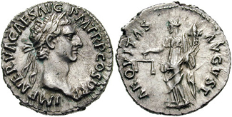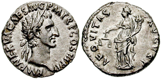 NERVA. 96-98 AD. AR Denarius (3.33 gm). Struck 96 AD. IMP NERVA CAES AVG P M TR P COS II P P, laureate head right / AEQVITAS AVGVST, Aequitas standing left, holding scales and cornucopiae. RIC II 1; BMCRE 1; RSC 3. (Image courtesy CNG) | |