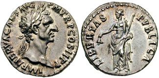 NERVA. 96-98 AD. AR Denarius (3.26 gm). Struck 97 AD. IMP NERVA CAES AVG - P M TR P COS II P P, Laureate head right / LIBERTAS PVBLICA, libertas standing left, holding pileus and sceptre. RIC II 19; BMCRE 46; RSC 113. (Image courtesy CNG) | |