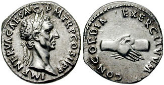 NERVA. 96-98 AD. AR Denarius (18mm, 3.57 gm). Struck 96 AD. IMP NERVA CAES AVG P M TR P COS II P P, laureate head right / CONCORDIA EXERCITVVM, clasped hands. RIC II 2; RSC 16. (Image courtesy CNG) | |