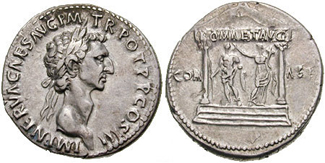 Nerva. 96-98 AD. AR Cistophoric Tetradrachm (10.60 gm). Struck 98 AD. IMP NERVA CAES AVG P M TR POT P P COS III, laureate head right / COM ASI, female standing facing on right, holding cornucopiae and crowning Nerva who is standing on left, within distyle temple; ROMA ET AVG inscribed on entablature. RIC II -; BMCRE 79; RSC 14a. (Image courtesy CNG) | |