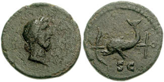 ANONYMOUS ISSUES. Period of Domitian to Antoninus Pius. Æ Quadrans (18mm, 3.11 g). Bearded head of Neptune right / Dolphin left coiled around anchor. RIC II p. 217, 16; Cohen 21. (Image courtesy CNG) | |