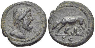 Anonymous issues. Time of Domitian to Antoninus Pius, AD 81-161. Æ Quadrans (15mm, 2.22 g, 7h). Head of Tiber right / She-wolf standing left, suckling twins, SC in exergue. RIC II 17. (Image courtesy CNG) | |