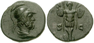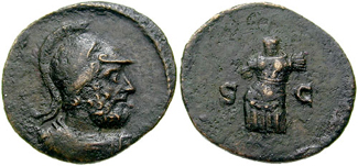Anonymous. Period of Domitian to A. Pius, circa AD 81-161. Æ Quadrans (2.92 g). Helmeted and draped bust of Mars right / S-C, Trophy. (Image courtesy CNG) | |