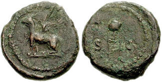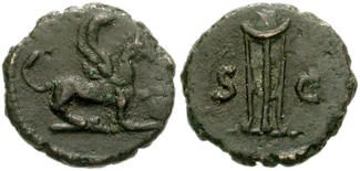 Anonymous issues. Time of Domitian to Antoninus Pius, AD 81-161. Æ Quadrans (13mm, 1.70 g). Griffin right, touching wheel with front paw / Tripod, S-C. RIC II 27; Cohen 39. (Image courtesy CNG) | |