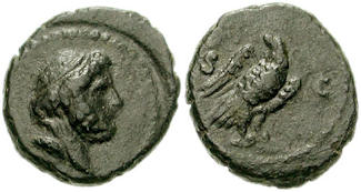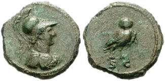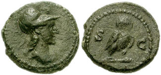 Anonymous issues. Time of Domitian to Antoninus Pius, AD 81-161. Æ Quadrans (14mm, 2.17 g). Rome mint. Helmeted bust of Minerva right / Owl standing right, SC in exergue. cf. RIC II 7 (SC in fields); cf. Cohen 7 (same). (Image courtesy CNG) | |