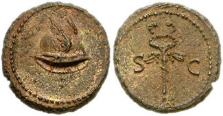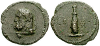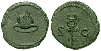 ANONYMOUS ISSUES. Time of Domitian to Antoninus Pius, circa 81-161 AD. Æ Quadrans (15mm, 2.29 g). Winged petasus left / Winged caduceus; S C in fields. RIC II 32; Cohen 36. (Image courtesy CNG) *** The two types, with the winged petasus right and the winged petasus left (next coin), are not distinguished from each other in RIC *** | |
