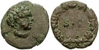ANONYMOUS. Period of Antoninus Pius. Æ Quadrans (18mm, 2.69 gm). Bust of child Spring right, wearing flower garlandand necklace of flowers / S C across field within vine wreath with grape bunches. RIC II pg. 219, 34 (Bacchus); J. Van Heesch, "Une représentation remarquable des quatre saisons sur semisses de l'époque antoninienne," in Studia Paulo Oblata Naster 3b; Mazzini pl. CXXI, 31; cf. Cohen 31 (tessera). (Image courtesy CNG) | |