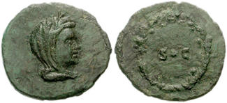 Anonymous issues. Time of Domitian to Antoninus Pius, AD 81-161. Æ Quadrans (18mm, 2.84 g, 6h). Rome mint. Veiled child’s head right, representing winter / SC in wreath of flowers. RIC II 35; J. van Heesch, "Une représentation remarquable des quatre saisons sur semisses de l'époque antoninienne," SPNO I, 1; Vagi 1175. (Image courtesy CNG) | |