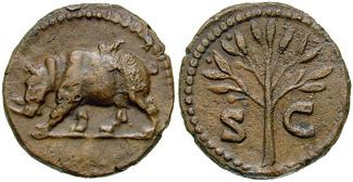 ANONYMOUS ISSUES. Period of Domitian to Antoninus Pius. Circa 81-161 AD. Æ Quadrans (2.97 gm). Rhinoceros left / SC, branch. RIC II 36; Cohen 2. (Image courtesy CNG) | |
