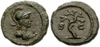 Anonymous issues. Time of Domitian to Antoninus Pius, AD 81-161. Æ Quadrans (15mm, 2.94 g, 6h). Rome mint. Helmeted and draped bust of Minerva right, wearing aegis / Olive tree. RIC II 9 var. (no aegis). (Image courtesy CNG) | |