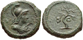 ANONYMOUS. Period of Domitian to Antoninus Pius, circa 81-161 AD. Æ Quadrans (15mm, 2.58 g, 6h). Helmeted and draped bust of Minerva right / S C across field, olive tree. RIC II 9; Cohen 4. (Image courtesy CNG) | |