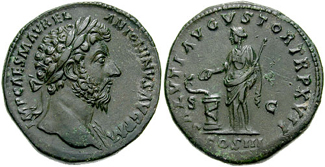 Marcus Aurelius. 161-180 AD. Æ Sestertius (25.66 gm). Struck 163 AD. IMP CAES M AVREL ANTONINVS AVG P M, laureate head right, drapery on left shoulder / SALVTI AVGVSTOR TR P XVII, COS III in exergue, S C across field, Salus standing left, feeding snake rising from altar. RIC III 844; BMCRE 1042; Szaivert 54-6/32; Cohen 564 var. (no drapery). (Image courtesy CNG) | |
