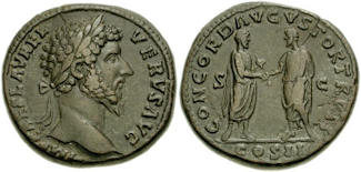LUCIUS VERUS. 161-169 AD. Æ Sestertius (32mm, 28.21 gm, 11h). Struck 162 AD. IMP CAES L AVREL VERVS AVG, laureate head right / CONCORD AVGVSTOR TR P II, COS II in exergue, S C across field, Marcus Aurelius standing right, holding roll in left hand and clasping right hand with Lucius Verus standing left and holding roll in left hand. RIC III 1309 (Marcus Aurelius); MIR 18, 30-16/30; BMCRE 1026 (Marcus Aurelius); Cohen 40 var. (bust type). (Image courtesy CNG) | |