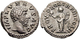 LUCIUS VERUS. 161-169 AD. AR Denarius (3.59 gm). Struck 162-163 AD. IMP L VERVS AVG, bare head right / PROV DEOR TR P III COS II, Providentia standing left, holding globe and cornucopaie. RIC III 491; BMCRE 229; Szaivert 56-14/10; RSC 156. (Image courtesy CNG) | |