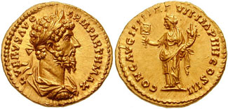 LUCIUS VERUS. 161-169 AD. AV Aureus (7.32 gm). Struck 166-167 AD. L VERVS AVG ARM PARTH MAX, laureate, draped, and cuirassed bust right / CONG AVG IIII TR P VII IMP IIII COS III, Liberalitas standing left, holding abacus and cornucopiae. RIC III 568; MIR 18, 155-12/37; Cohen 52. (Image courtesy CNG) | |