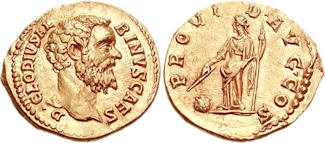 Clodius Albinus. As Caesar, AD 193-195. AV Aureus (7.17 g, 12h). Rome mint. Struck AD 193. D CLODIVS AL-BINVS CAES, bare head right / PROVI-D AVG COS, Providentia standing left, holding wand in right hand over globe to left, leaning on scepter in her left hand. RIC IV 1a (rarity 4); Calicó 2420 corr. (wand not roll; rarity 5, illustrated by line drawing); BMCRE 38 note (citing Cohen, none in the BM); Hunter -; Cohen 57 (citing Vienna specimen). (Image courtesy CNG) | |