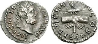 Clodius Albinus. AD 195-197. AR Denarius (2.71 g, 11h). Lugdunum (Lyon) mint. 2nd series. IMP CAES D CLO ALBIN AVG, Laureate head right / FIDES LEGION COS II, Clasped hands, holding legionary aquila. RIC IV 20b; Lyon 23; RSC 24. (Image courtesy CNG) | |