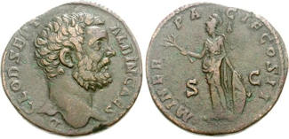 Clodius Albinus. As Caesar, AD 193-195. Æ Sestertius (24.83 g, 12h). Rome mint. Struck AD 194-195. D CLOD SEPT ALBIN CAES, bare head right / MINER PA-CIF COS II, S C across field, Minerva standing facing, head left, holding up olive branch in right hand, resting left on round shield set on ground, vertical spear resting against left arm. RIC IV 54a; Banti 18; BMCRE 535. (Image courtesy CNG) | |