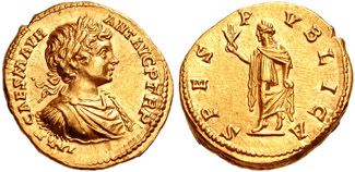 CARACALLA. 198-217 AD. AV Aureus (7.32 gm). Struck 198 AD. IMP CAES M AVR ANT AVG P TR P, laureate, draped, and cuirassed bust right / SPES P-VBLICA, Spes advancing left, holding flower and raising hem of skirt. RIC IV 26(b); BMCRE -; Calicó 2820; Cohen 598. (Image courtesy CNG) | |