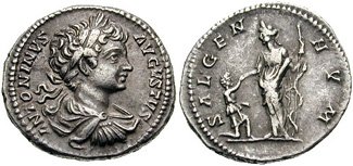 CARACALLA. 198-217 AD. AR Denarius (3.16 gm). Struck 201 AD. ANTONINVS AVGVSTVS, laureate, draped and cuirassed bust right / SAL GEN - HVM, Salus standing left, holding sceptre entwined with serpent, extending right hand to kneeling figure. RIC IV 42c; BMCRE 169; RSC 558a. (Image courtesy CNG) | |